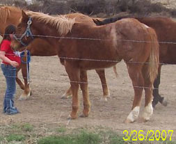 "Lil Joe" is pictured at Ayers Ranch August of 2006, then again at the Phelps' Ranch on March 26, 2007. "Joe is starting to shed out and is a beautiful red roan. He is such a pleasure and so very gentle, as you can see the grandkids can do just about anything with him. He loves to be brushed and get all the attention. Will send some more pictures soon of this beautiful horse." by Bud Phelps.